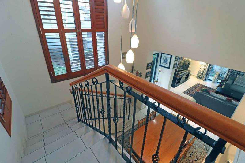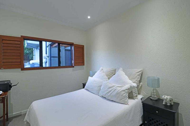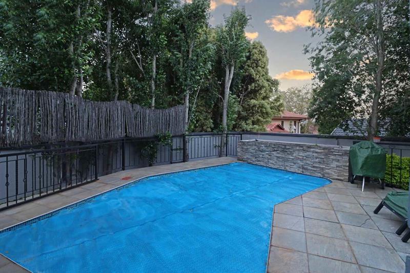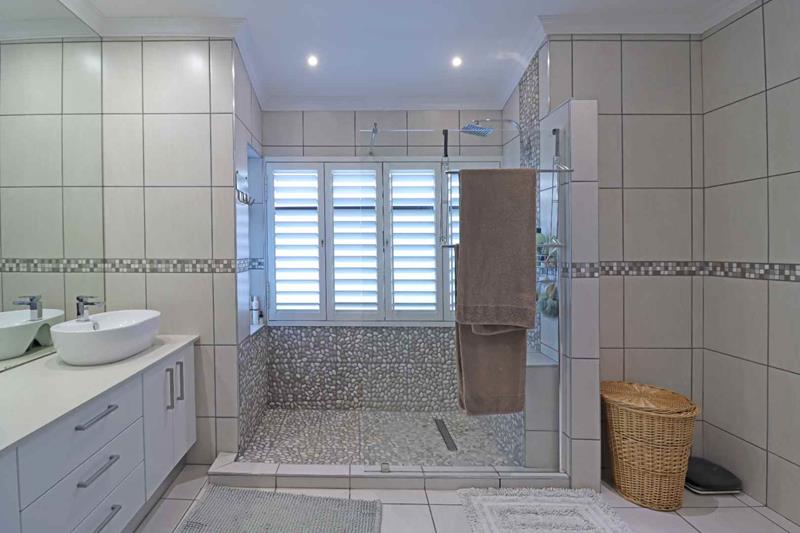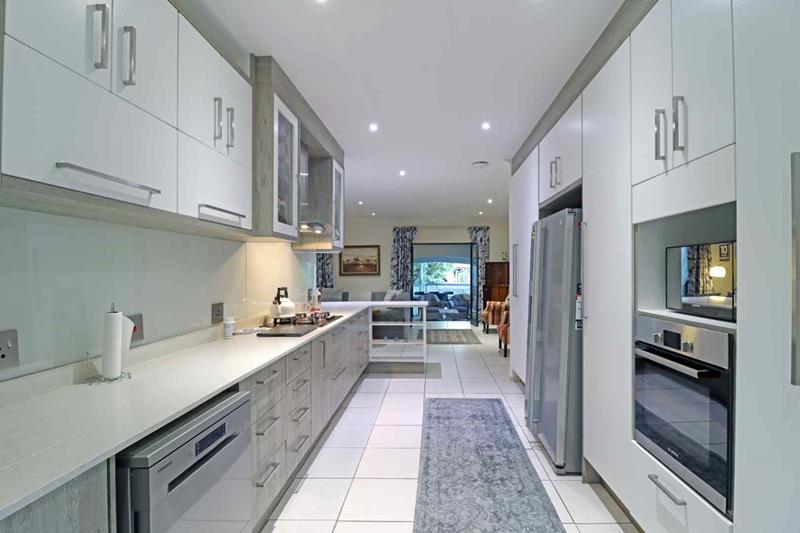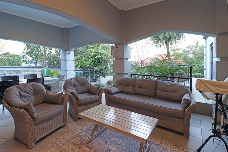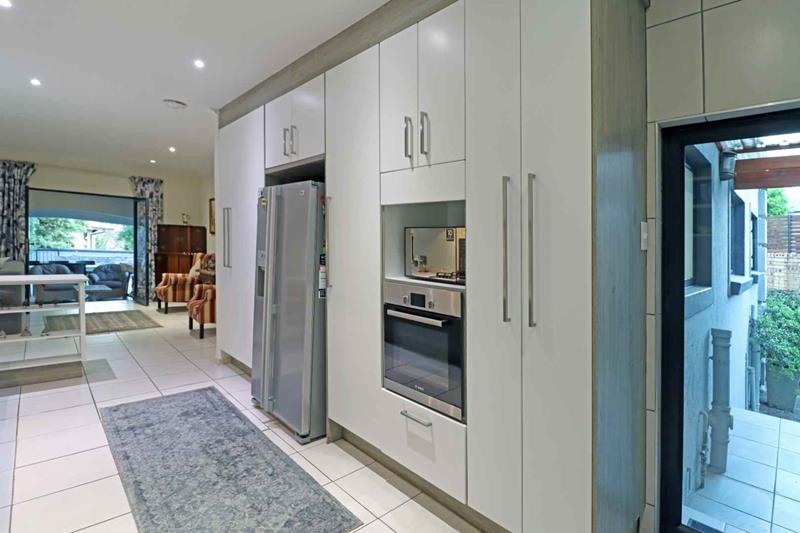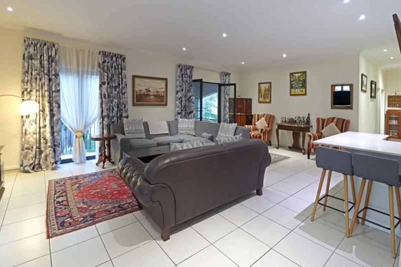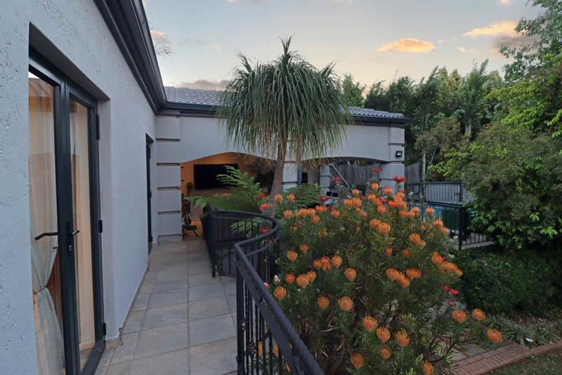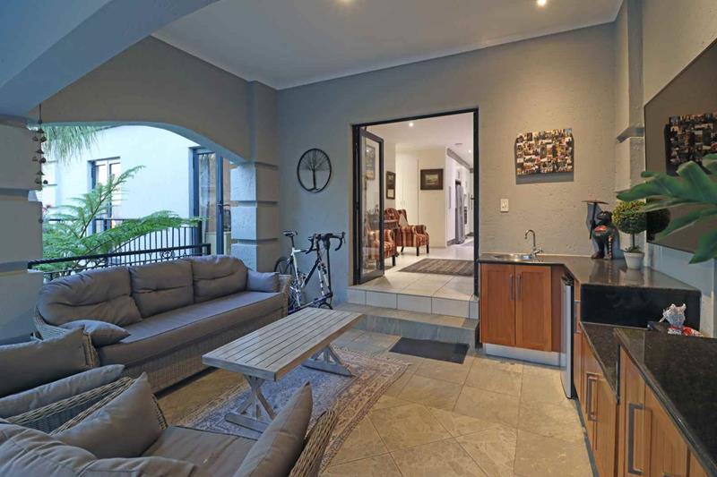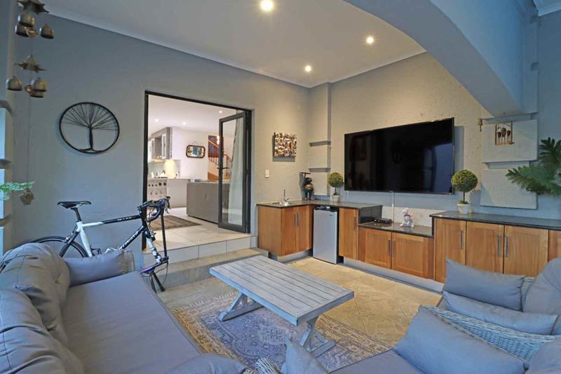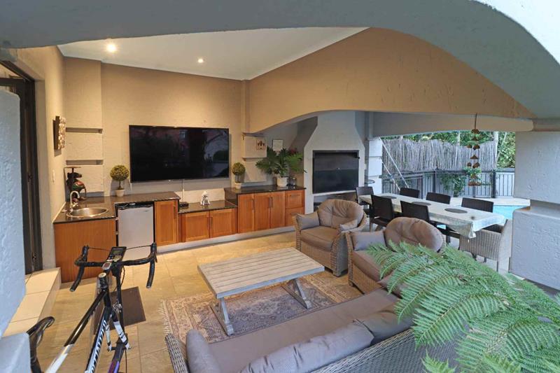 The TV room and dining room create inviting living spaces, designed for both relaxation and connection. An enclosed patio with a built-in braai opens to the garden and sparkling pool — a true entertainer’s dream.