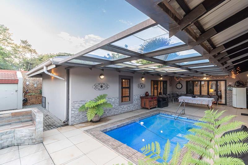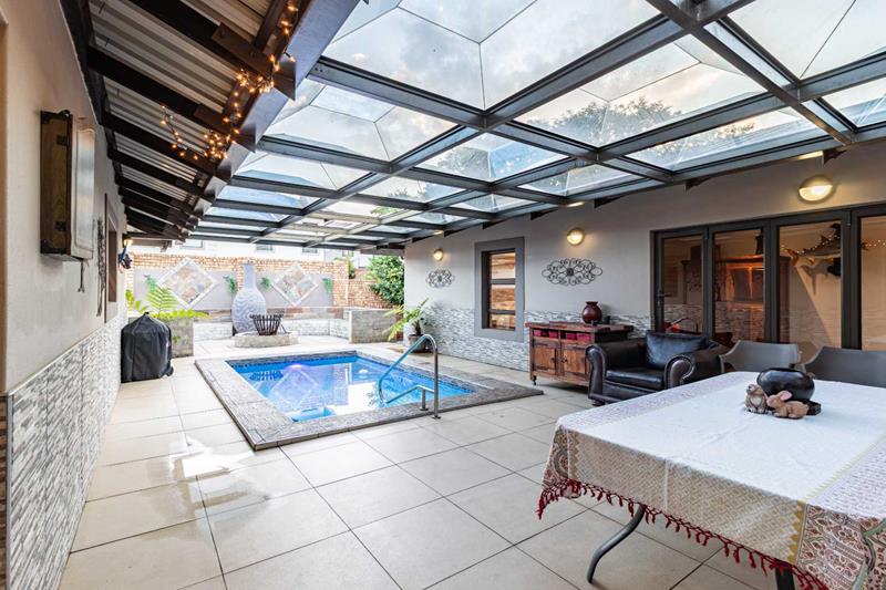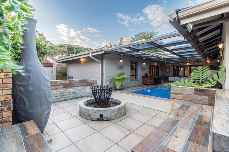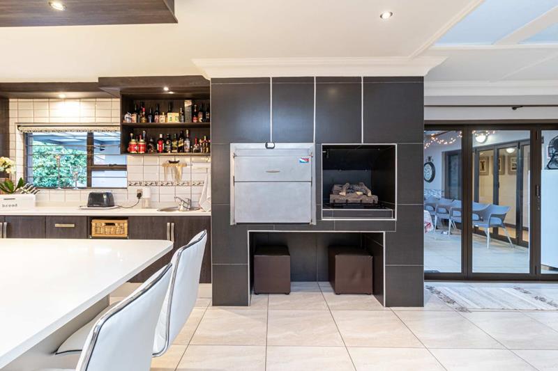 Staking aluminum doors open to the undercover patio and heated pool.The designed braai area is perfect for all year-round entertaining.